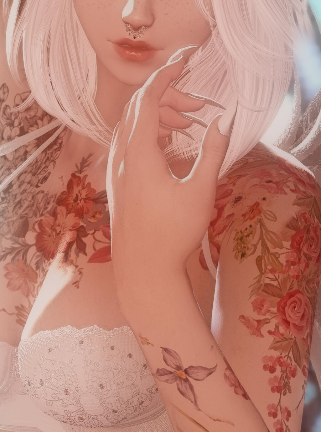 | quirks | pierced ears and septum, floral tattoos, painted nails |